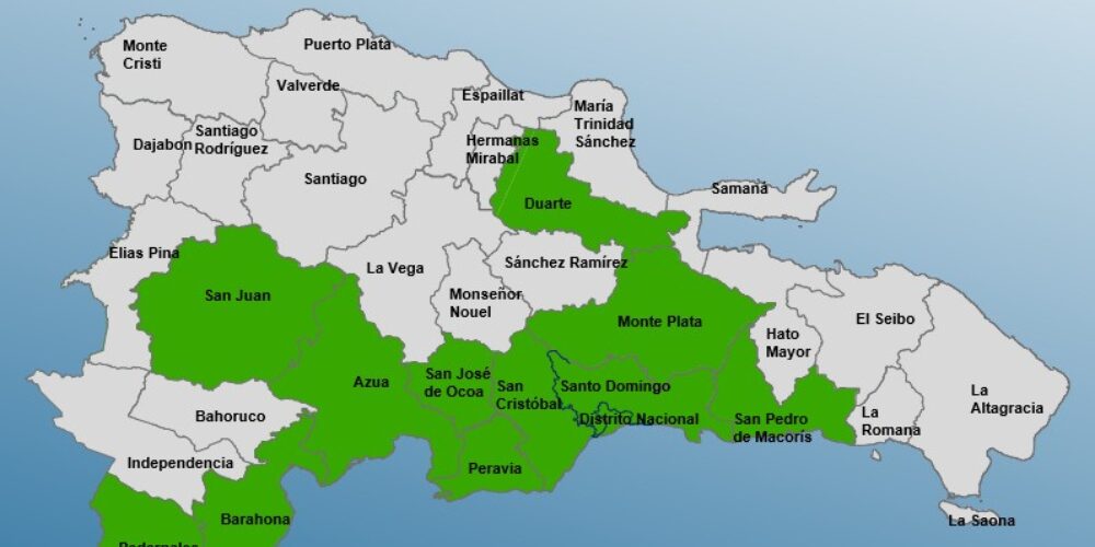 Las provincias bajo alerta son: Santo Domingo, Distrito Nacional, San Cristóbal, San José de Ocoa, San Juan, Peravia, Azua, Barahona, Pedernales, Monte Plata, Duarte y San Pedro de Macorís.