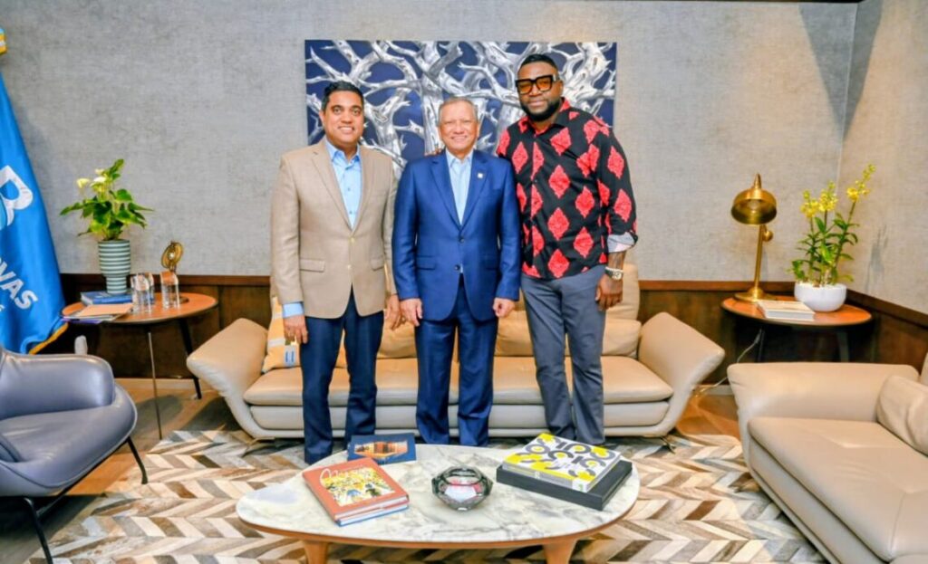 SANTO DOMINGO.-El presidente ejecutivo de Banreservas, doctor Leonardo Aguilera, sostuvo un encuentro en su despacho con el exjugador de Grandes Ligas y Salón de la Fama, David Ortiz, y el ministro de Deportes y Recreación, Kelvin Cruz.