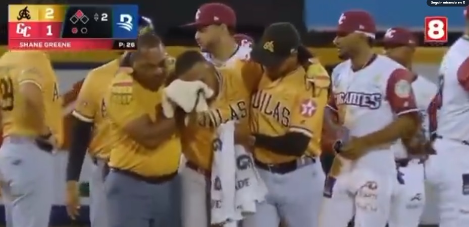 SAN FRANCISCO DE MACORÍS.– El jardinero de las Águilas Cibaeñas, Alberto Rodríguez, Novato del Año de la Liga Dominicana de Béisbol, tuvo que abandonar el partido de este lunes frente a los Gigantes del Cibao luego de recibir un fuerte golpe en el rostro producto de un tiro desde los jardines, mientras corría hacia la segunda base.