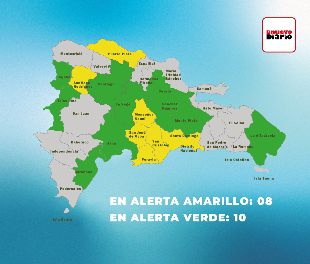 Mientras que en alerta verde se mantienen 10 provincias: La Altagracia, Elías Piña, Azua, Monte Plata, Dajabón, Barahona, Santiago, Sánchez Ramírez, Duarte (especialmente el Bajo Yuna) y La Vega.