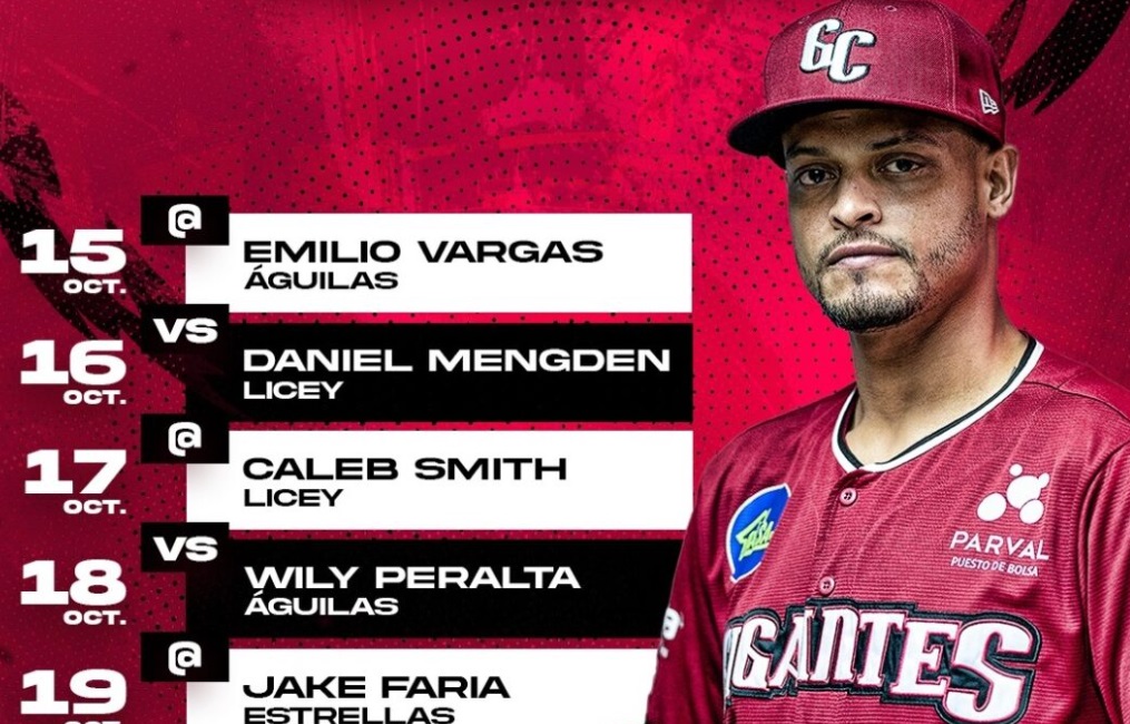 La programación de abridores de los Gigantes del Cibao para los primeros cinco encuentros será la siguiente: