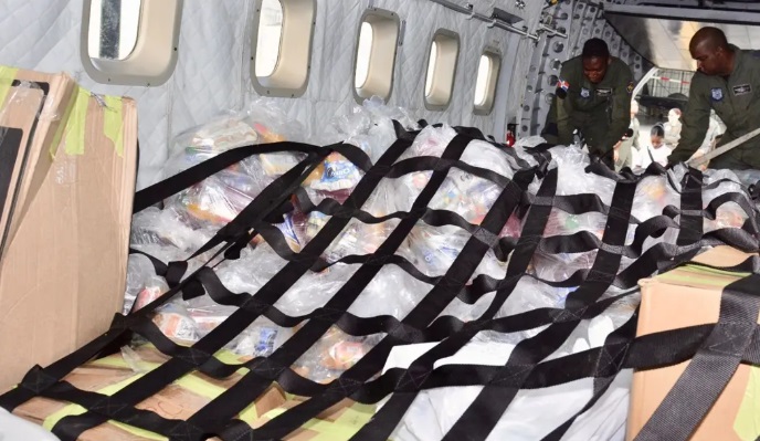 * Un avión de transporte de la Fuerza Aérea de República Dominicana, encargado del envío inicial de alimentos y medicamentos esenciales.