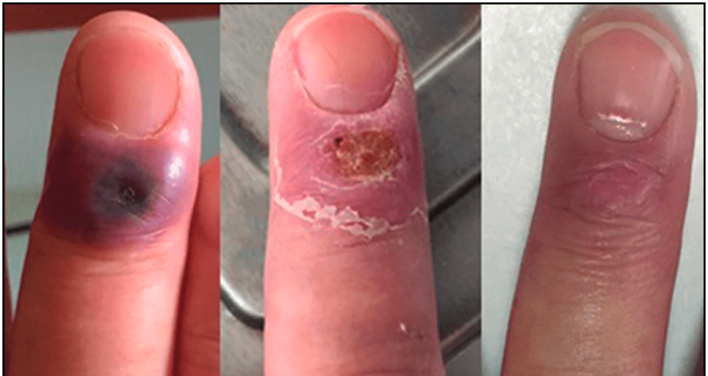 Los primeros síntomas incluyen picazón en la piel expuesta y luego aparecen una gran ampolla o úlcera, que adquiere un cascarón negro que la cubre.